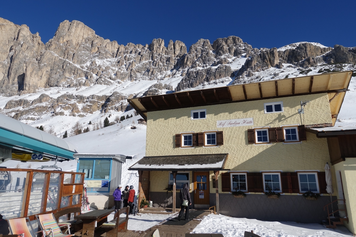 Mit oder ohne Ski lässt sich auch die weit oben gelegene Paolina-Hütte besuchen – zu ihr führte um 1950 der erste Skilift der Gegend, einer der ersten in ganz Südtirol. Und bestimmt gab’s damals auch schon „sauleckere“ Jausen, frischen Kaiserschmarrn, heißen Kakao. Sogar Vögel genießen den tollen Ausblick von der Sonnenterrasse. Diesen Teil der Dolomiten gehört zum UNESCO-Weltnaturerbe.