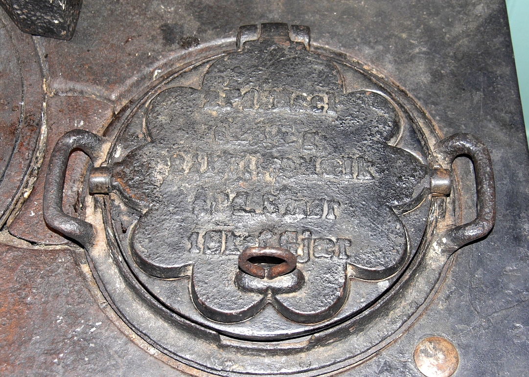 In einer Küche der alten Häuser dann stand ein eiserner Kochherd, der mich neugierig machte. Der hatte nämlich nicht nur eine typische Kochplatte, sondern daneben auch eine komisch beschriftete eherne Klappe. Buchstaben in Gusseisen, halb verwittert. Und beim Öffnen der Klappe zeigte sich – tataaa! – ein Waffeleisen!! Dachte ich mal so, sah es doch innen genauso aus wie Mutters elektrisches zuhause, mit fünf Herzen… Noch mal hingeguckt, extra Fotos gemacht, Neugier auf später verschoben