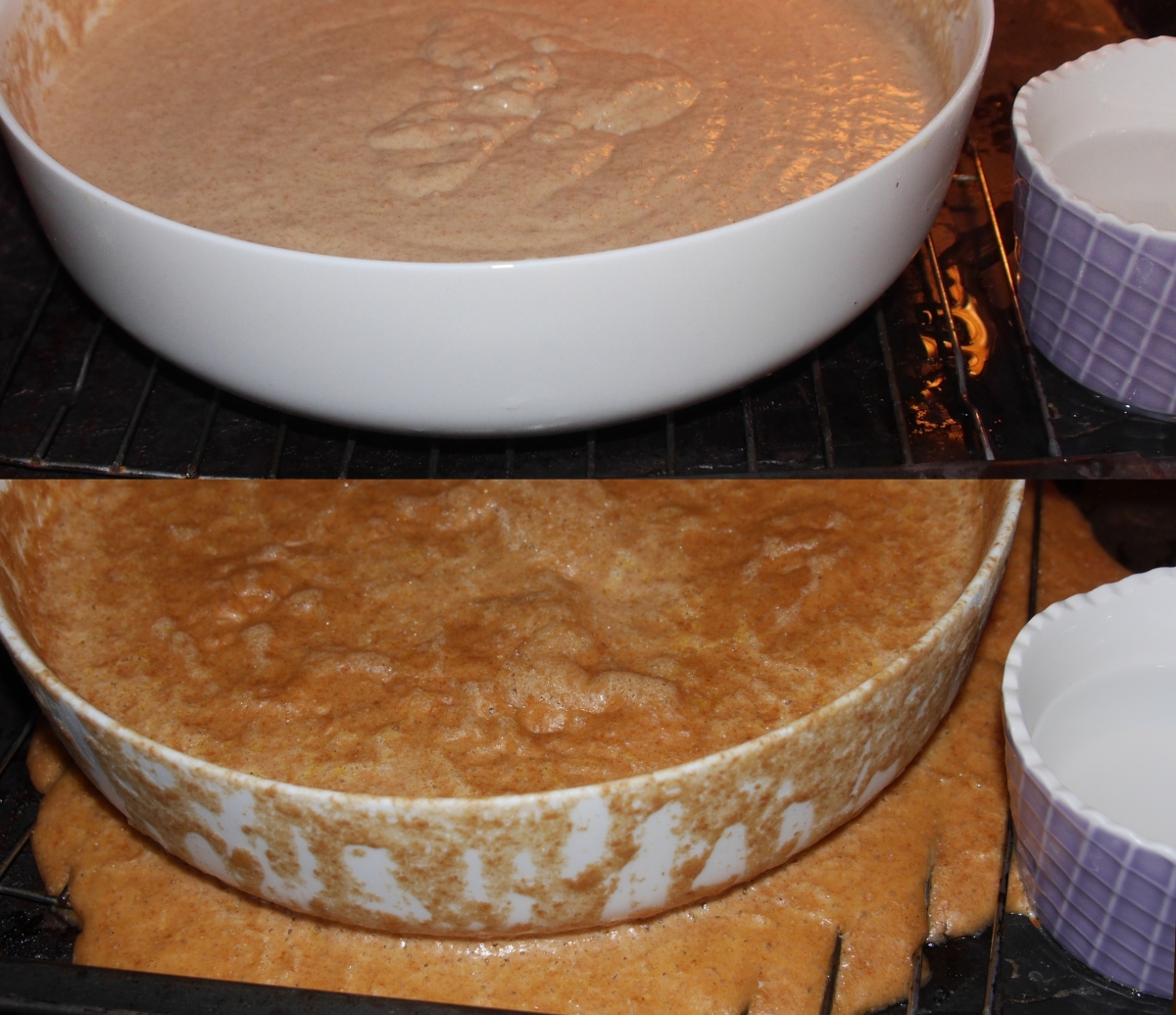 Ooops…. Ging doch schneller und und voll über den Rand, vielleicht wärs auf der Heizung mit Tuch drüber besser gewesen? Egal, alles einmal umrühren, fühlt sich immer noch an wie ein dickflüssiger Waffelteig…