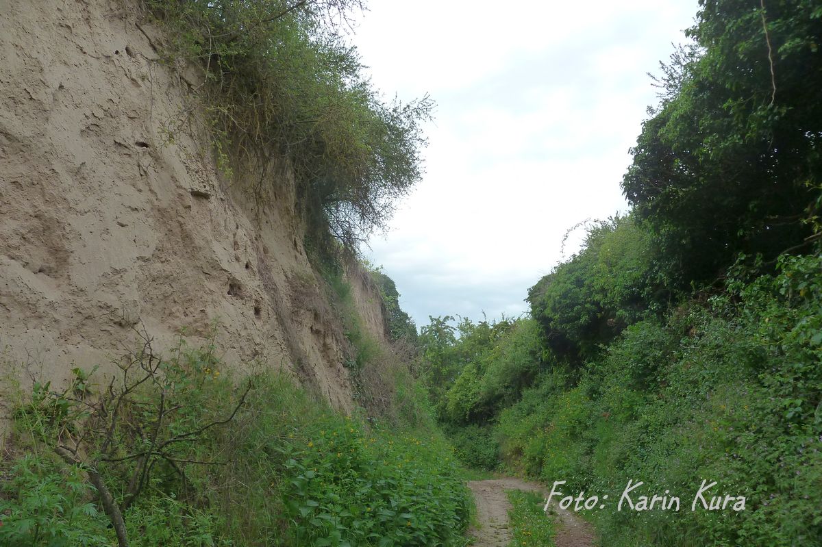 Kurz darauf fällt der Weg leicht ab, und wie durch eine Schlucht läuft man zwischen zwei Erdwänden hindurch. Sie bestehen aus einer Lehm-Löss-Schicht und können bis zu zehn Metern Höhe erreichen. Entstanden sind die kleinen Schluchten und Hohlwege im Laufe der Jahrhunderte, als die Menschen mit schwer beladenen Ochsenkarren unterwegs waren.