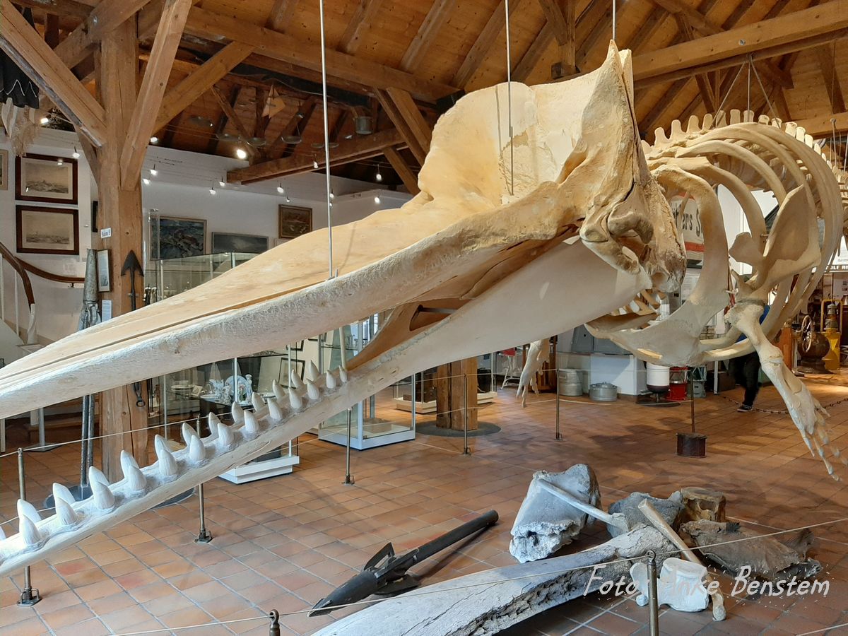 Das Heimatmuseum im Dykhaus fällt als erstes das riesige Pottwalskelett ins Auge, das mitten im Raum hängt. Drumherum gibt es jede Menge zu Borkum und seiner Vergangenheit zu entdecken: Vögel, Trachten, Schifffahrt, Grabsteine und sogar eine Sandsammlung.