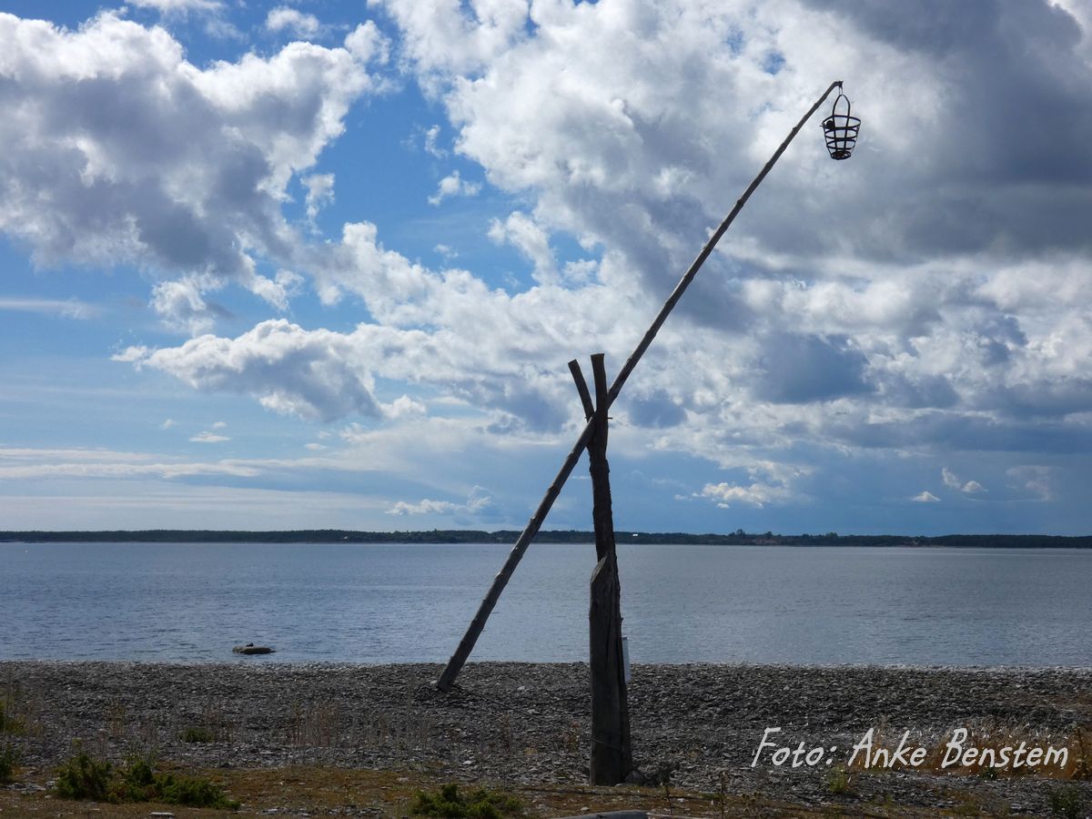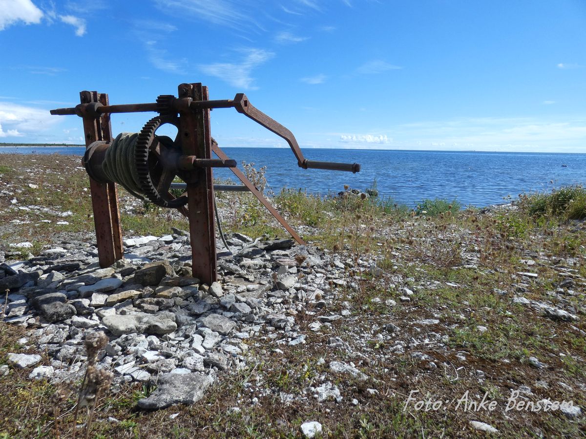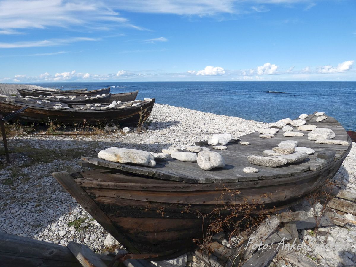 Heute parken oberhalb der Hütten ein paar Wohnmobile, aber der Ort ist alles andere als überlaufen. Neben den Hütten trocknen auch heute im Netzgarten ein paar Fischernetze auf hölzernen Gestellen. Genial einfach sind die alten Leuchtfeuer, Eisenkörbe, die man an einem Pfosten in die Höhe zog, um so von See wichtige Stellen an Land zu markieren. Mit dicken Steinen abgedeckte Boote liegen am Ufer, Seilwinden warten darauf, sie aus dem Wasser zu ziehen. Hier arbeitete Ende des 18. Jahrhunderts auch Bodilla Christina Jacobsdotter als einzige Frau. Doch Båta-Bol, wie sie genannt wurde, segelte sogar unerschrocken allein nach Visby und behauptete sich unter den Fischern. Nach ihr ist eine der beiden gelben Autofähren benannt, die über den Fårösund pendelt.