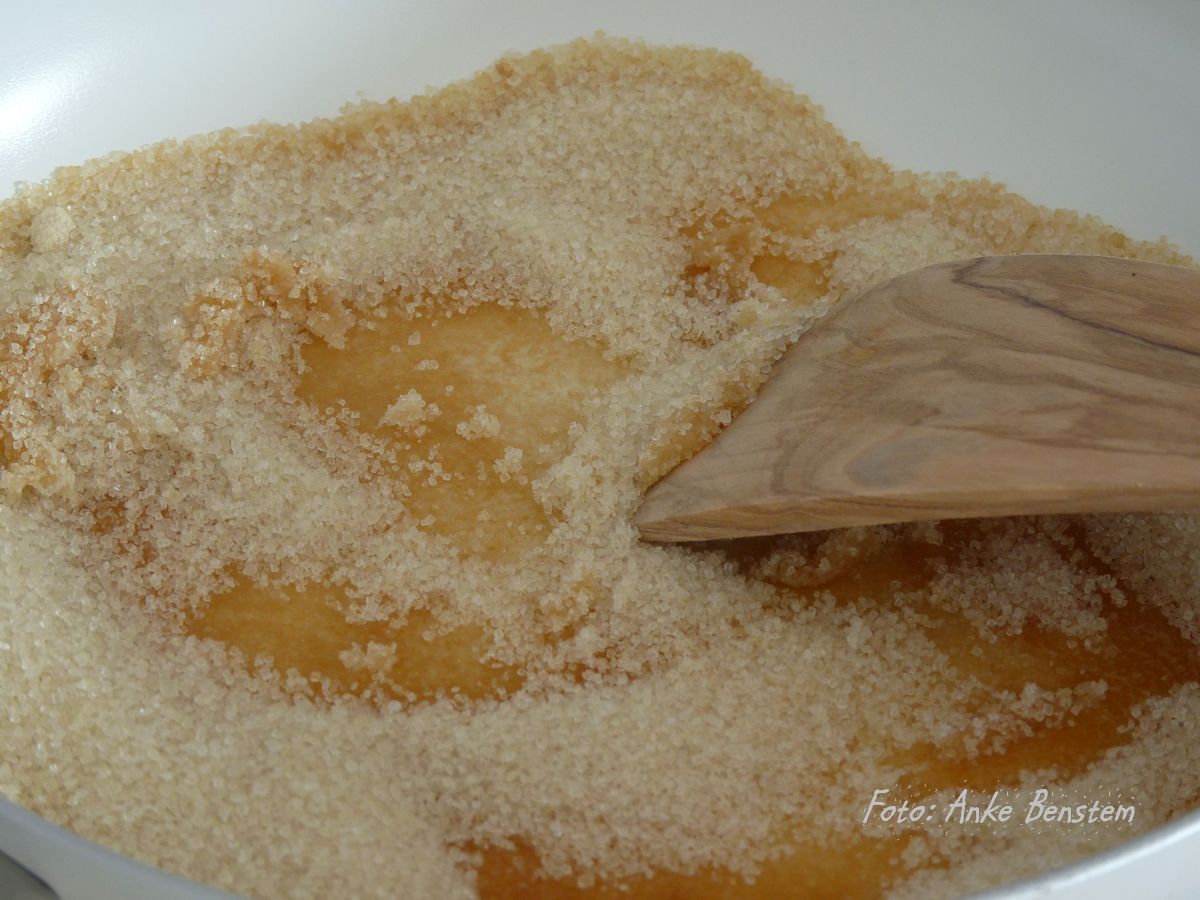 200 g braunen Zucker in der Pfanne erhitzen, bis er schmilzt. Die Temperatur etwas herunterdrehen und unter Rühren komplett flüssig und mittelbraun werden lassen. Er fängt dann irgendwann an Blasen zu werfen (aber Achtung, er darf nicht zu dunkel werden, dann ist er schon verbrannt!)