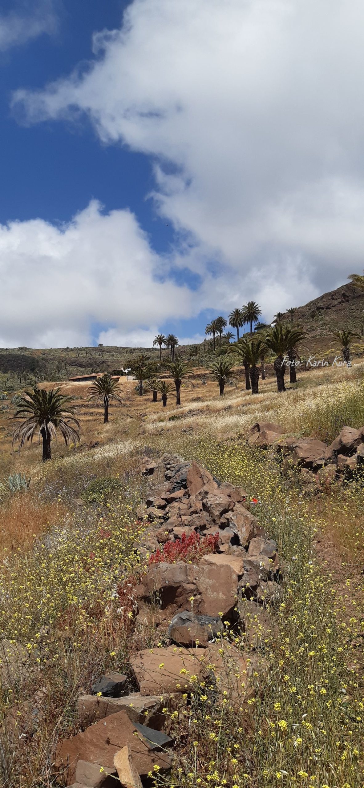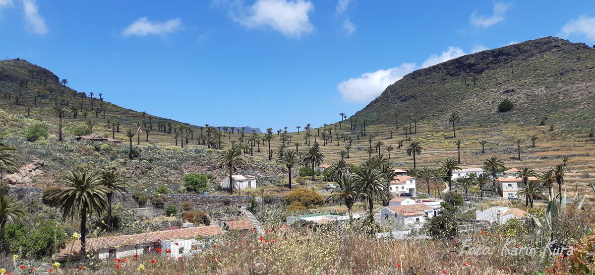 Mich weniger, ich ziehe die Schluchten vor. Herrlich bestückt mit Dattel-Palmen, für mich eigentlich das Schönste. Nirgends auf den Kanaren gibt es so viele Palmen wie auf La Gomera. Typisch sind auch die Terrassenfelder. Es ist unglaublich, die Vorstellung, dass Menschen an jedem der steilen und steilsten Berghänge hunderte von Terrassen-Mäuerchen errichtet haben, Stein für Stein aufeinandergesetzt. Mangels natürlicher ebener Flächen für landwirtschaftlichen Anbau. Heute sind viele der Terrassenfelder verwildert, die Mauern zerfallen.