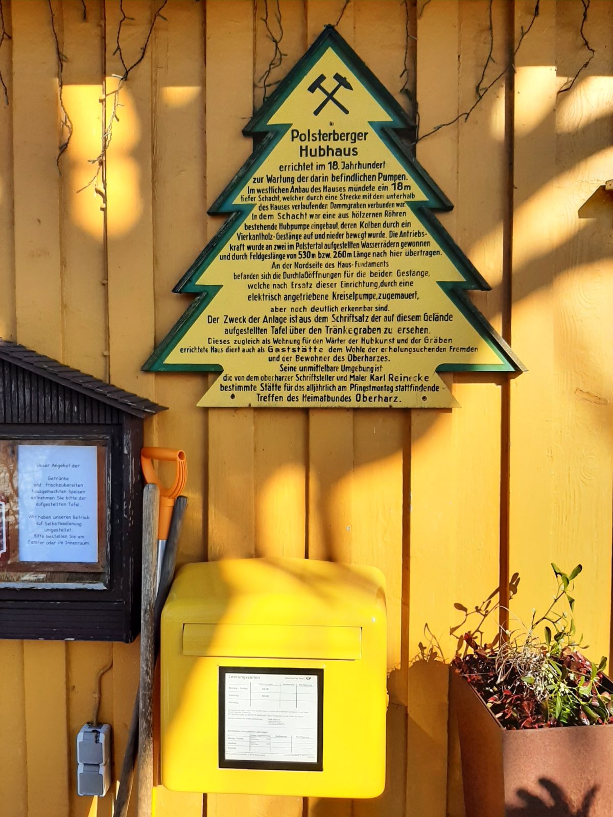 Die Waldgaststätte Polsterberger Hubhaus ist heute als Teil der Oberharzer Wasserwirtschaft ein Kulturdenkmal und steht unter Denkmalschutz. An der alten gelben Fassade hängt nicht nur überraschenderweise ein Briefkasten (hier, mitten im Wald?), sondern auch eine Dennert-Tanne. Die Tafel in Form einer Tanne informiert überall im Harz über Sehenswürdigkeiten. Einst ein Grabenwärterhaus, haben die ältesten Teile des Hubhauses nämlich schon vier Jahrzehnte auf dem Buckel.