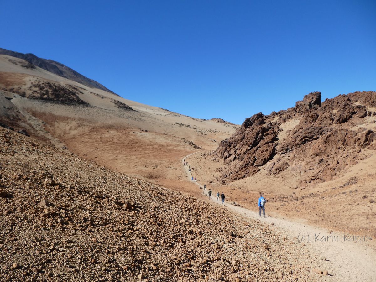Ein staubiger Pfad führt durch diese Halbwüste, gespickt mit mehr oder weniger vertrockneten Ginsterbüschen. Bleiche Äste liegen herum. Die Szenerie erinnert an den amerikanischen Wilden Westen. Und selten waren meine Wanderschuhe dermaßen eingestaubt wie hier. Dabei ist die Luft am Teide frei von Verschmutzung und sehr trocken. Der Naturforscher Alexander von Humboldt bemerkte hier im 18. Jahrhundert „die Durchsichtigkeit der Luft“, und sie bietet immer wieder herrliche Ausblicke auf die Nachbarinsel La Gomera.