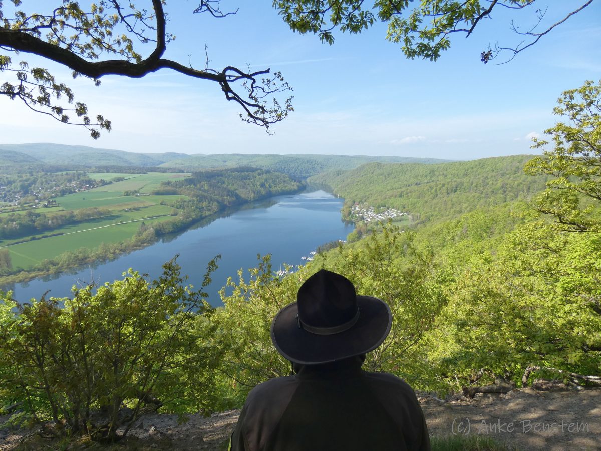 Wir steigen weiter ab und sind bald am Wasser angekommen. Der Stausee ist jetzt, Anfang Mai, ganz gefüllt, manche Buchen stehen sogar mit den Füßen im Nass. Das wird sich im Laufe des Sommers ändern, wenn das Seewasser nach und nach über die Eder in Weser und Mittellandkanal fließt und diese so schiffbar hält.