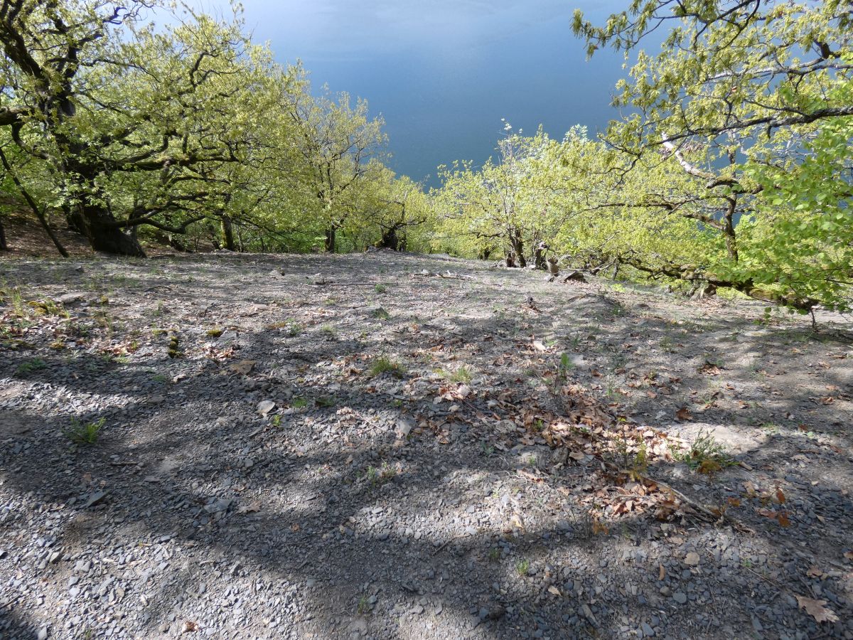 Wir laufen auf Seeniveau los. Die Landschaft verändert sich zusehends. An den extrem steilen Hang der Kahlen Hardt krallen sich bald nur noch kleine Eichen mit verschlungenen Ästen an den Boden, ab und zu mischt sich eine Elsbeere dazwischen. Hier möchte man nicht ins Rutschen kommen. Weit, weit unten schimmert das Blau des Sees, Hitze flimmert schon jetzt, im Mai, über der hellen Blockschutthalde. Die Landschaft wirkt mit den knorrigen Eichen immer mehr wie am Mittelmeer.