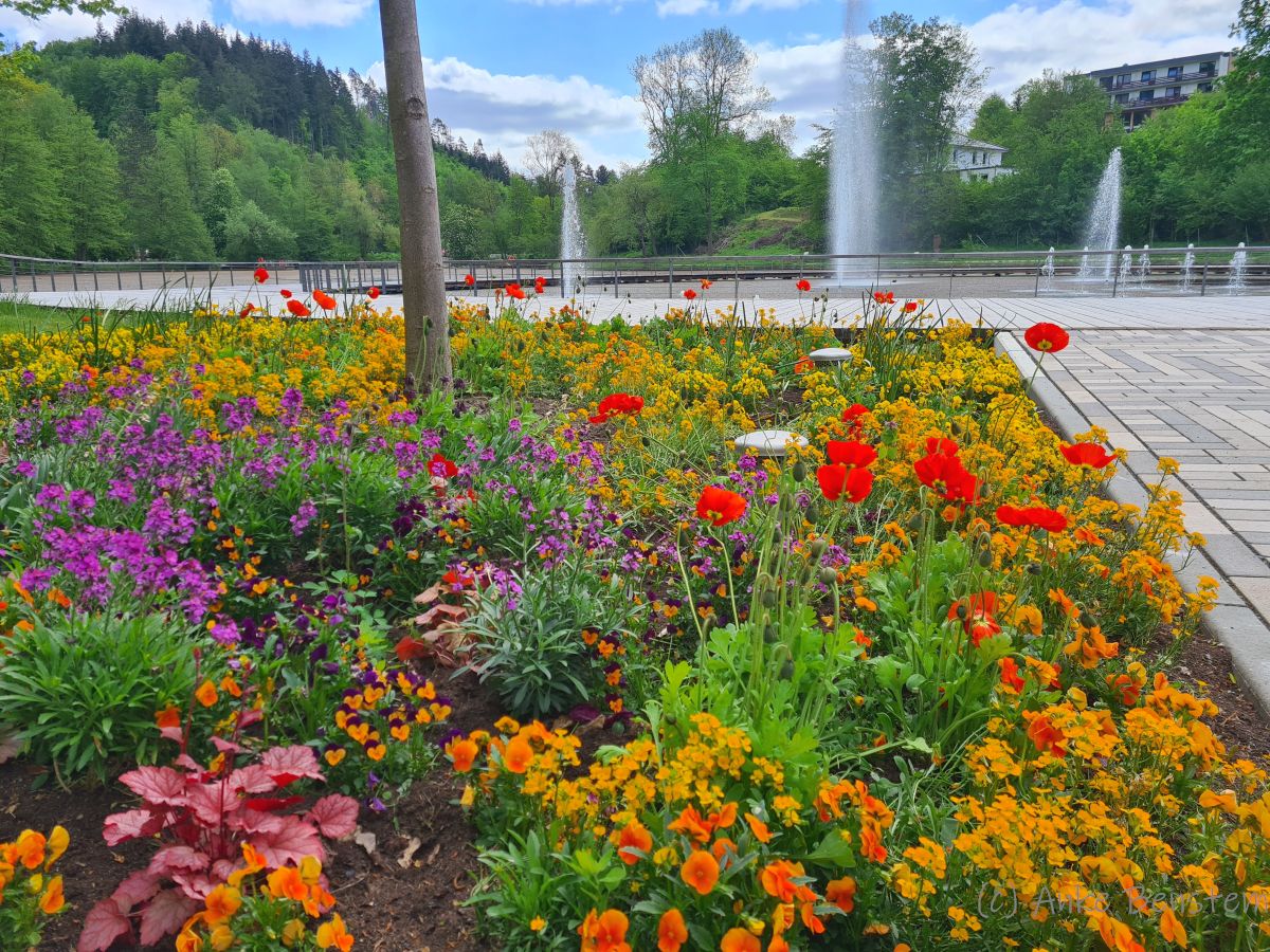 Niedersachsens Landesgartenschau (LaGa) findet in diesem Jahr in Bad Gandersheim statt. Die Kleinstadt im Harzvorland ist ein Sole-Heilbad – wer den Eingang Mitte nimmt, kann an der öffentlichen Rositha-Quelle direkt salziges Heilwasser probieren. Der Ort liegt zwischen Leine, Weser, Solling und eben dem Harz. Eigentlich hätte die LaGa hier schon im letzten Jahr sein sollen, doch, so liest man, es fehlte offenbar unter anderem an so viel Baumaterial, dass die Veranstaltung um ein Jahr verschoben wurde. Jetzt jedenfalls scheint alles fertig zu sein, alles blüht und strahlt, passend zum zugegeben etwas beliebigen Motto Garten.Fest.Spiele. Mitte Mai, es ist noch angenehm kühl und hat zuvor immer mal wieder geregnet. Die Landschaftsgärtner müssen also noch nicht gegen die Dürre, wie wir sie in den letzten Jahren auch schon früh im Jahr hatten, ankämpfen. Hoffentlich bleibt das so.