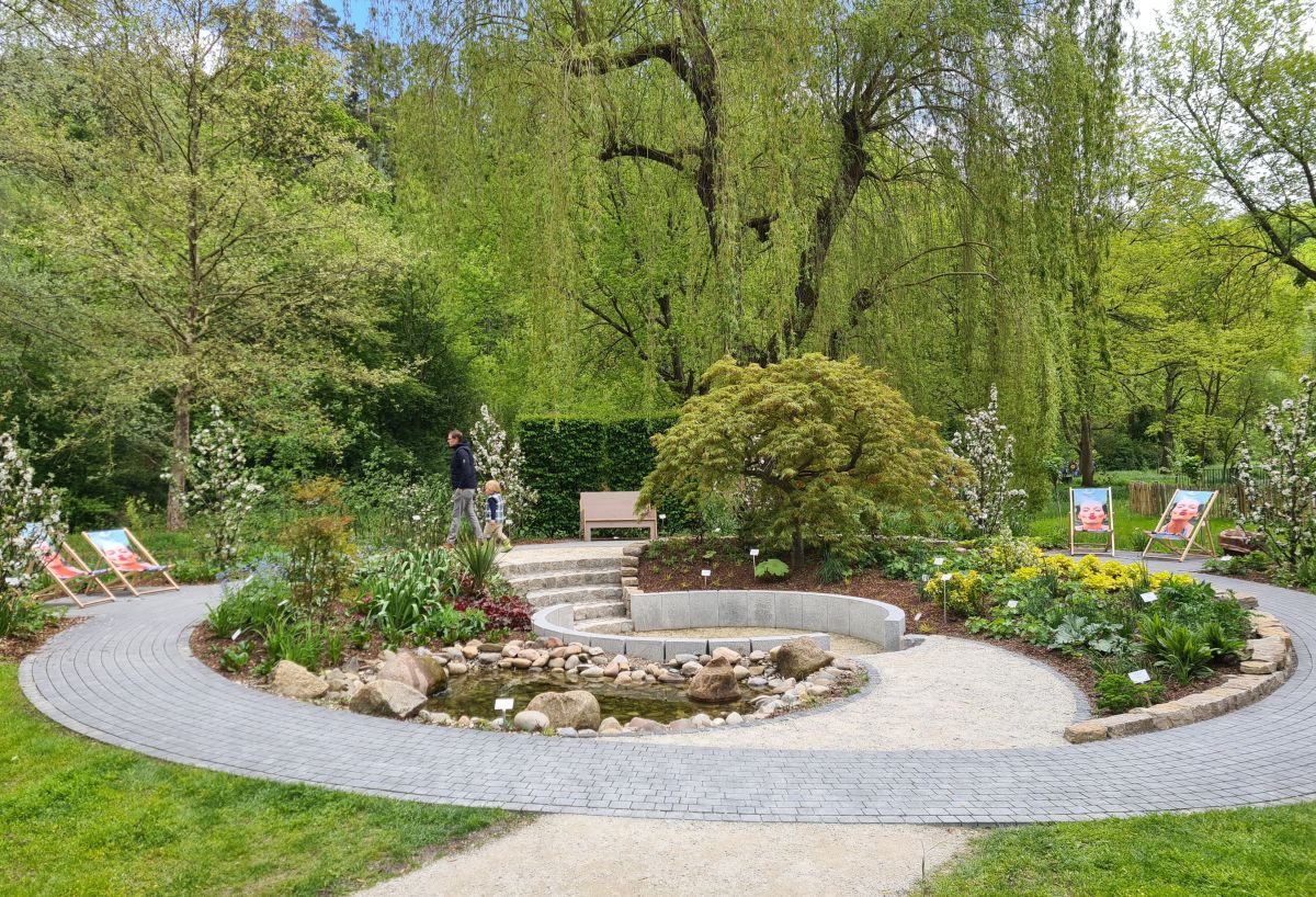 Das Gelände der 7. niedersächsischen Landesgartenschau in Bad Gandersheim erstreckt sich in einem Tal entlang des Flüsschens Gande. An den Hängen seitlich davon wächst Buchen-Mischwald. Hin und wieder mogelt sich am Fluss eine weiß blühende Kastanie ins Bild. Das neue Sole-Natur-Freibad ist noch nicht in Betrieb (es ist einfach noch zu kalt), aber im Hochsommer wird es sicher ein Magnet, vor allem für Kinder. Auf den Osterbergseen sind schwimmende Gärten installiert und insgesamt 13 verschiedene Blumenschauen sind im Laufe des Sommers geplant. Am Wegesrand steht überraschend mal ein Hexenhäuschen, mal eine Fass-Sauna.