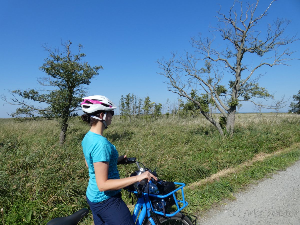 Im Natura 2000 Reservat flüchten unzählige Schwäne aufs Wasser, als wir uns nähern. Kormorane sitzen in den bleichen Resten von Bäumen, am Ufer wächst wilder Hopfen. Das nahe Wasser verführt zu zahlreichen Pausen und Fotostopps. Einfach die Spätsommersonne genießen und aufs Wasser schauen. Dann gehts schließlich doch zurück aufs Rad, es liegt noch einiges an Strecke vor uns.