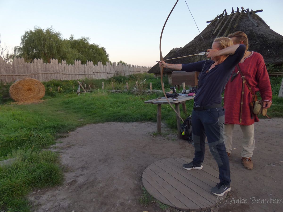 Los gehts bei den originalgetreuen Nachbauten von Wikingerschiffen. Ein paar Holzhäuser weiter backen in einem offenen Ofen Fladenbrot und Kekse, nebenan gibt es süßen Met. Und um die Ecke können Besucher selbst Hand anlegen und eine einfache Wikingerpuppe aus Leinenstoff und Wolle basteln. Überall wird gewebt, geschnitzt, getöpfert oder mit dem Bogen geschossen. Außerhalb des Dorfes ist die rustikale Wikingersauna angeheizt. Wir bekommen, als es schon dämmert, ein mittelalterliches Mahl aufgetischt. Es gibt Salat und Fisch, und die Fladenbrote, mit Schafskäse und Kräutern belegt und frisch aus dem Holzofen, sind zum Niederknien lecker.