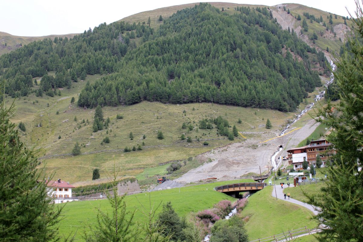 Je höher wir kommen, desto entspannter wird die Lage. Aber auch nach der italienischen Grenze haben sich selbst kleine Bäche respektabel aufgeplustert. Auch Langtaufers Karlinbach reißt Uferstücke mit, Bäume und größeres Geröll. Als ich im vergangenen Jahr dort war, hatte eine größere Welle eine Brücke mit sich gerissen. Mit Baggern wurde alles wieder hergerichtet.