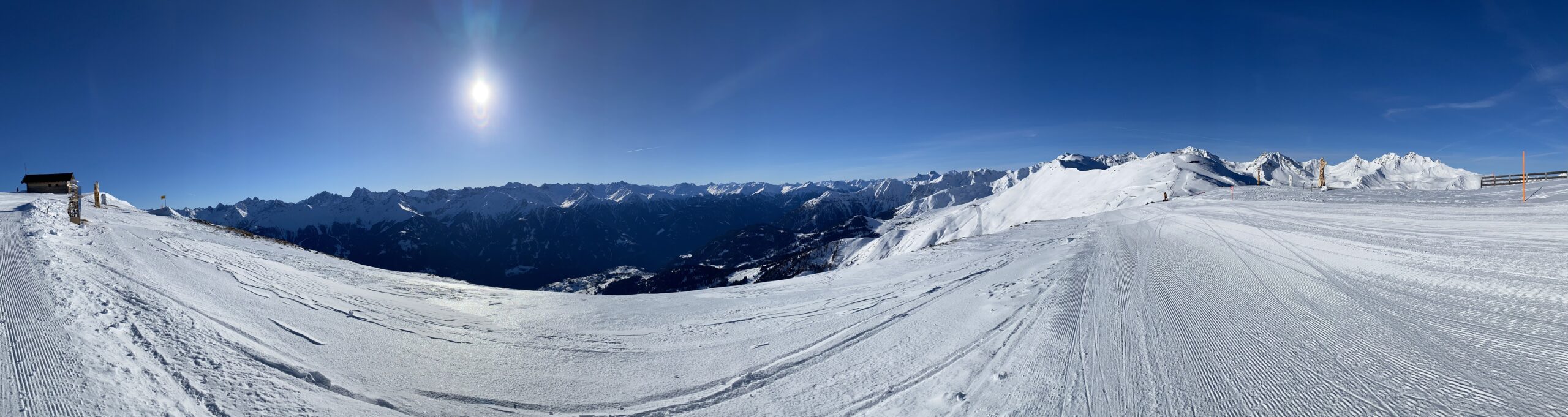 Schon vorweg genommen: Ich bin nach dem vorzüglichen Menü richtig dankbar, noch einen schönen Spaziergang zurück ins Dorf Fiss machen zu können. Ein Verdauungsspaziergang ist genau das Richtige! Auf dem gleichen Weg quasi wie schon am Vormittag hinauf. Gestartet bin ich um 10 Uhr mit der Schönjochbahn, einer Gondel, über die Mittelstation Steinegg bis hoch zur Endstation auf 2436 Metern. Erwartet hat mich ein traumhaftes Panorama über das ziemlich große Skigebiet Serfaus-Fiss-Ladis! Die drei Bergdörfer liegen auf einem sonnenreichen Hochplateau über dem oberen Tiroler Inntal. Sie bieten Skispaß zwischen 1200 und 2828 Meter Höhe – und damit im Winter ziemliche Schneesicherheit. Und 100 Kilometer gebahnte Wanderwege in der kalten Jahreszeit.