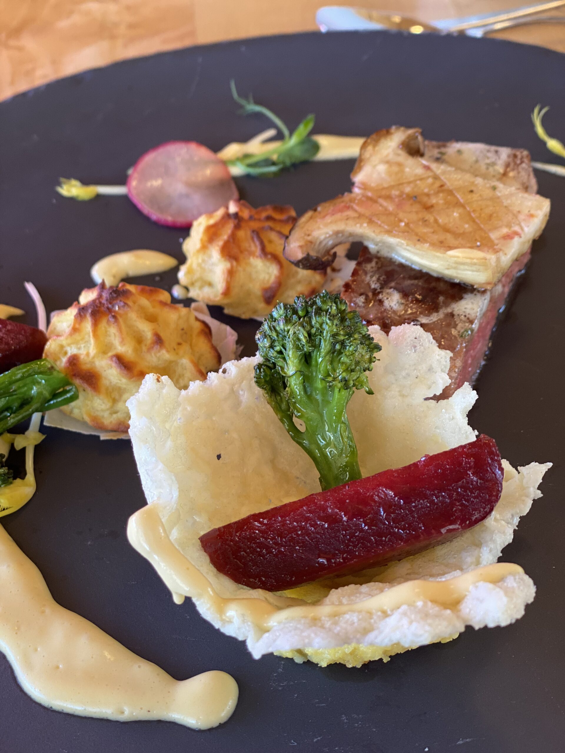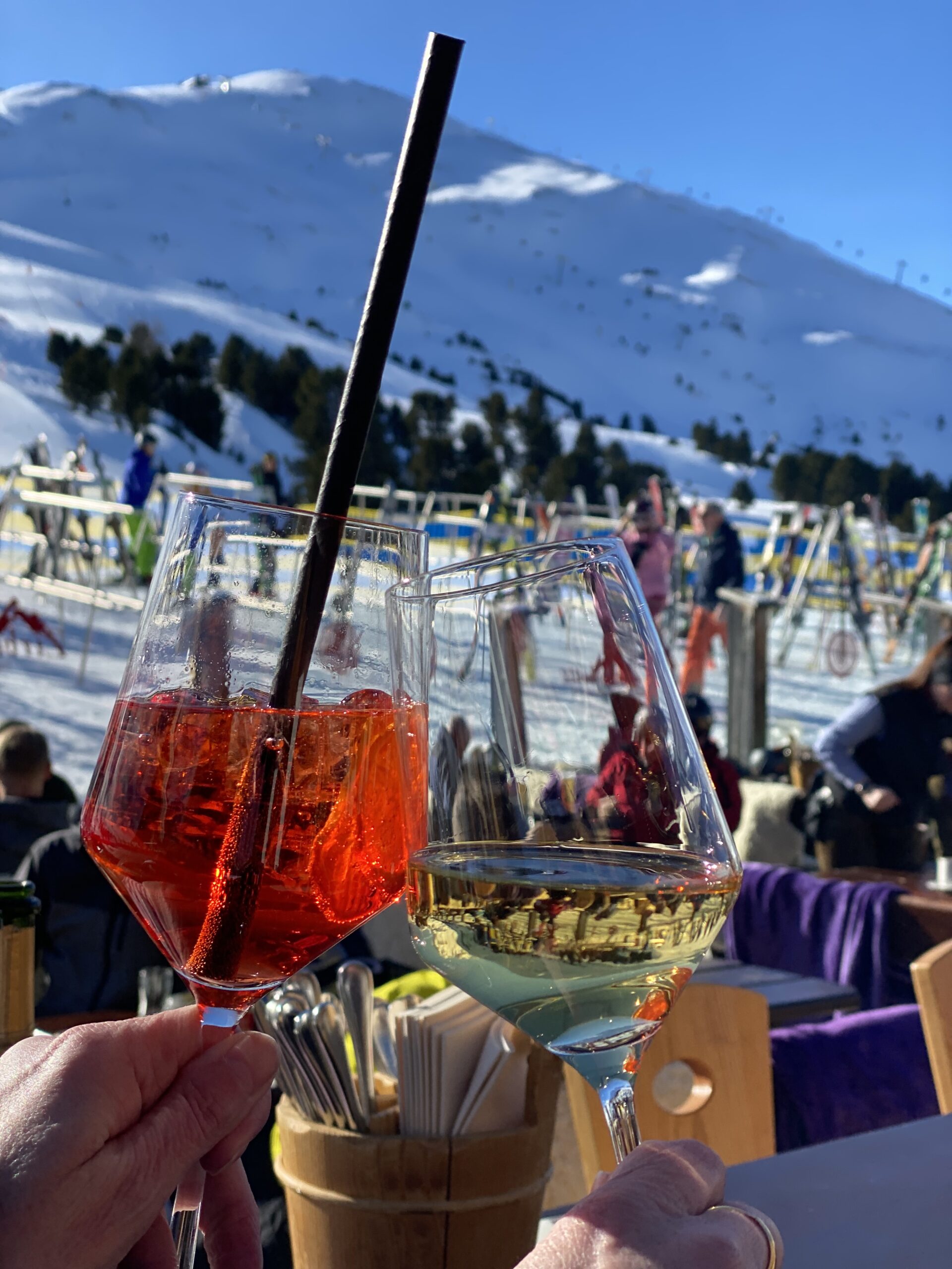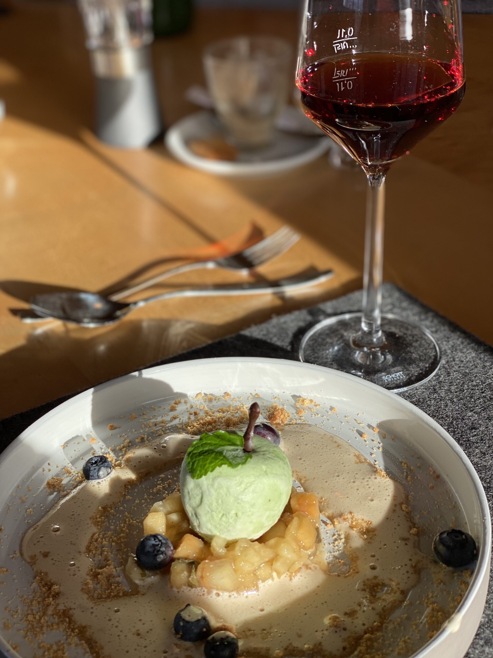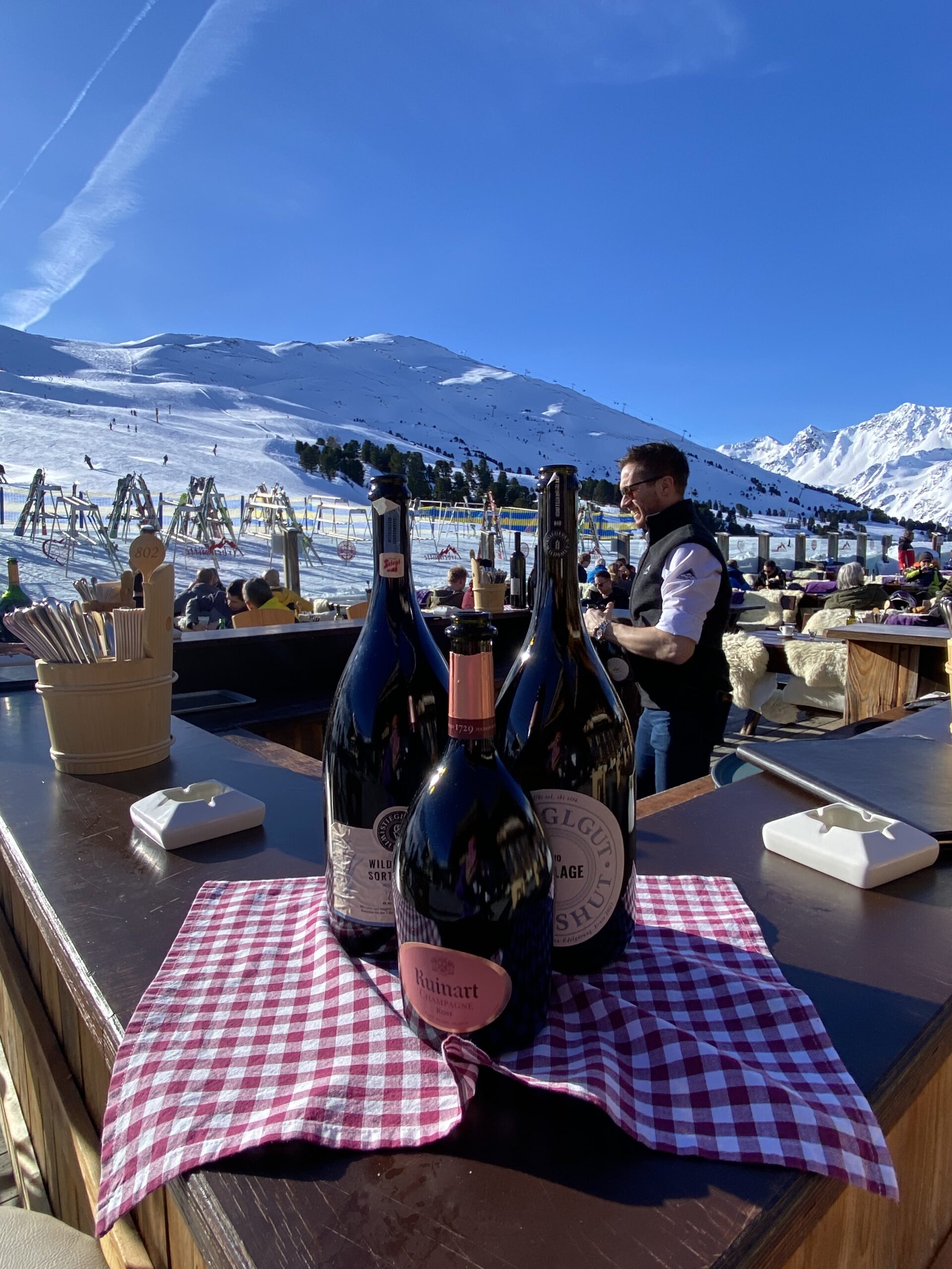 In der urigen Stube mit Feuerstellen und traditionellen Wandmalereien vom Fisser Blochziehen im Inneren der Zirbenhütte serviert Philipp das Menü „Genuss 2100“. Für die Skifahrer, die es sich mal richtig gut gehen lassen wollen – und mehr Zeit mitbringen als nur für den schmackhaften Kaiserschmarrn auf der Speisekarte. Ein Gang leckerer als der andere. Köstlich einfach die cremige Kürbisingwersuppe, aber auch die knusprige Landentenbrust und später das Dry Aged Beef vom Tiroler Grauvieh! Die Rinder leben ganz in der Nähe auf der Schöngampalm und betreiben laut Philipp dort „natürliche Landschaftspflege“. Die berühmte Imperial Gerste aus Fiss findet sich nicht nur im Eintopf wieder, sondern auch in der Suppe, dem Risotto, Brot, dem Bier und natürlich dem neuen Tiroler Whisky „Fissky“…. Die Skifahrer sitzen natürlich meist draußen auf der großen Sonnenterrasse auf gemütlichen Fellen bei einem leckeren Glas Aperol Spritz oder Bierchen!