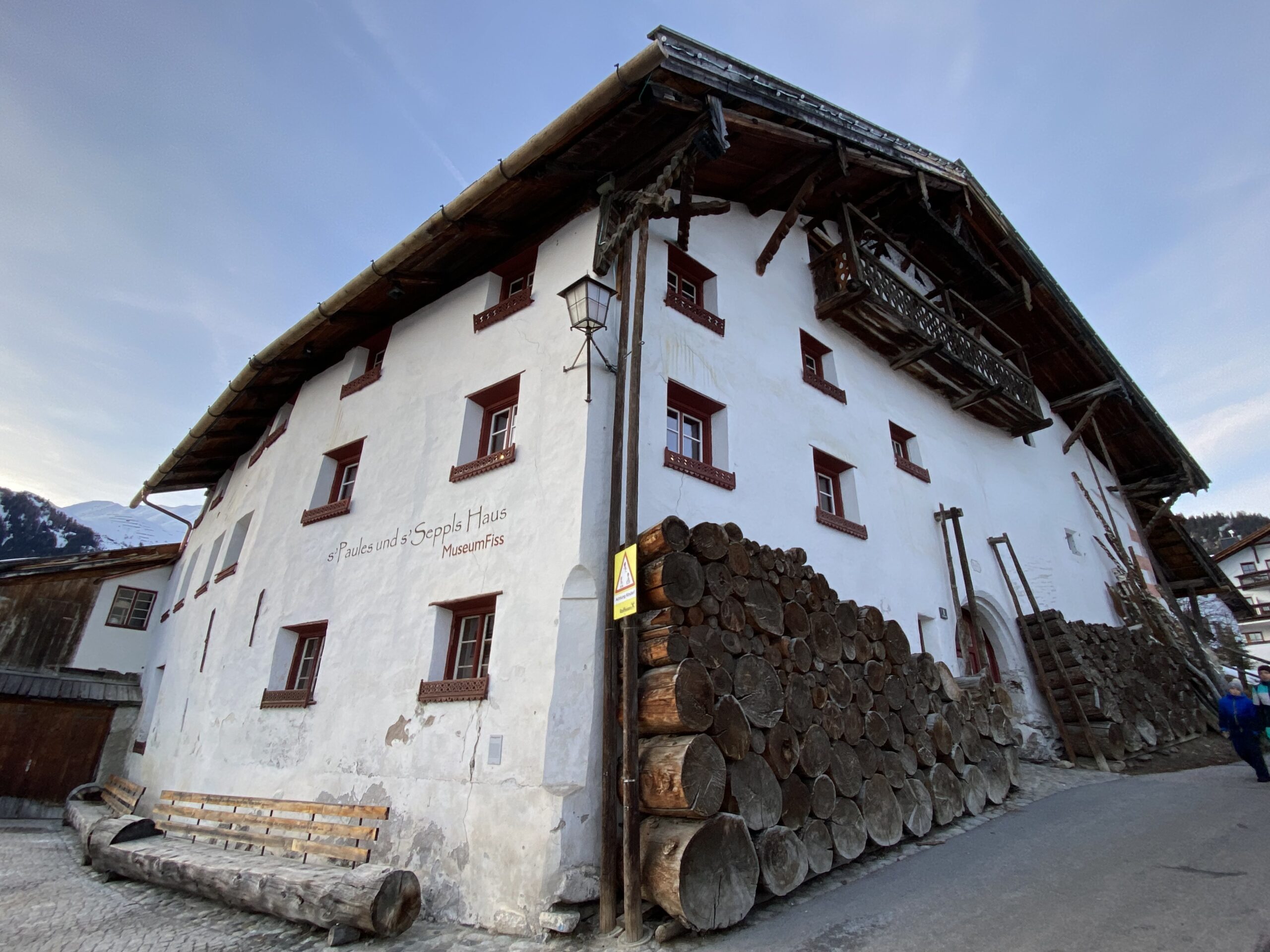Nach dem netten Mittagessen geht’s wieder runter ins Dorf. Mich erwartet noch Ulrike Wachter. Die Fisserin zeigt mir ein interessantes, kleines Heimatmuseum. Eins der letzten Zeugnisse bäuerlicher Baukultur im Tiroler Oberland. Der Ortskern von Fiss verfügt noch über historische Bauernhäuser aus dem 15. Jahrhundert. Im „S’Paules und s’Seppls-Haus“ gab es archäologische Funde aus dem 5.-7. Jahrhundert. Die Grundmauern des Hofes stammen aus dem Jahre 1411. Hier lebten zwei Familien unter einem Dach, mit bis zu 25 Personen. In dem „kleinen Dorf unter einem Dach“, einem so genannten Mittelflurhaus, waren die Familie Pale und die Bregenzers zuhause. Ein gemeinsames Wohnen ohne große Privatsphäre. Spannend und etwas gruselig sind die Texte und Tonbandmitschnitte von Isidor Pale. „Der komische Kauz lebte als Nachtwächter und Totengräber von 1886-1967 in dem Haus“, erklärt mir Museums-Obfrau Ulrike. Die Einfachheit der Einrichtung, die simplen Ställe, Werkzeuge und Holzkarren geben mir das Gefühl, die Bäuerin wäre nur kurz im Garten – und würde jeden Moment zurückkommen…