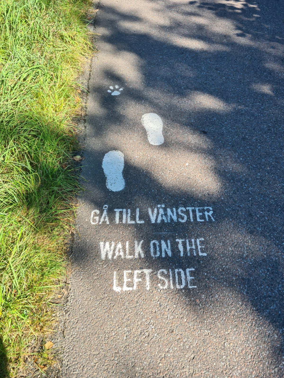 Der Inselort zieht sich die Küste entlang, mit süßen bunten Holzhäusern (und dem kleinen Muminhaus!), alten Villen und einigen schicken Neubauten, die sich aber meist gut in der Landschaft verstecken. Auf dem Weg weisen Füße und eine Schrift darauf hin, dass man links gehen soll. Wenn die Fähre wieder ein Schwung Besucher auf die Insel gebracht hat, die sich den schmalen Weg dann mit den Transportmofas teilen, ein durchaus wichtiger Hinweis.