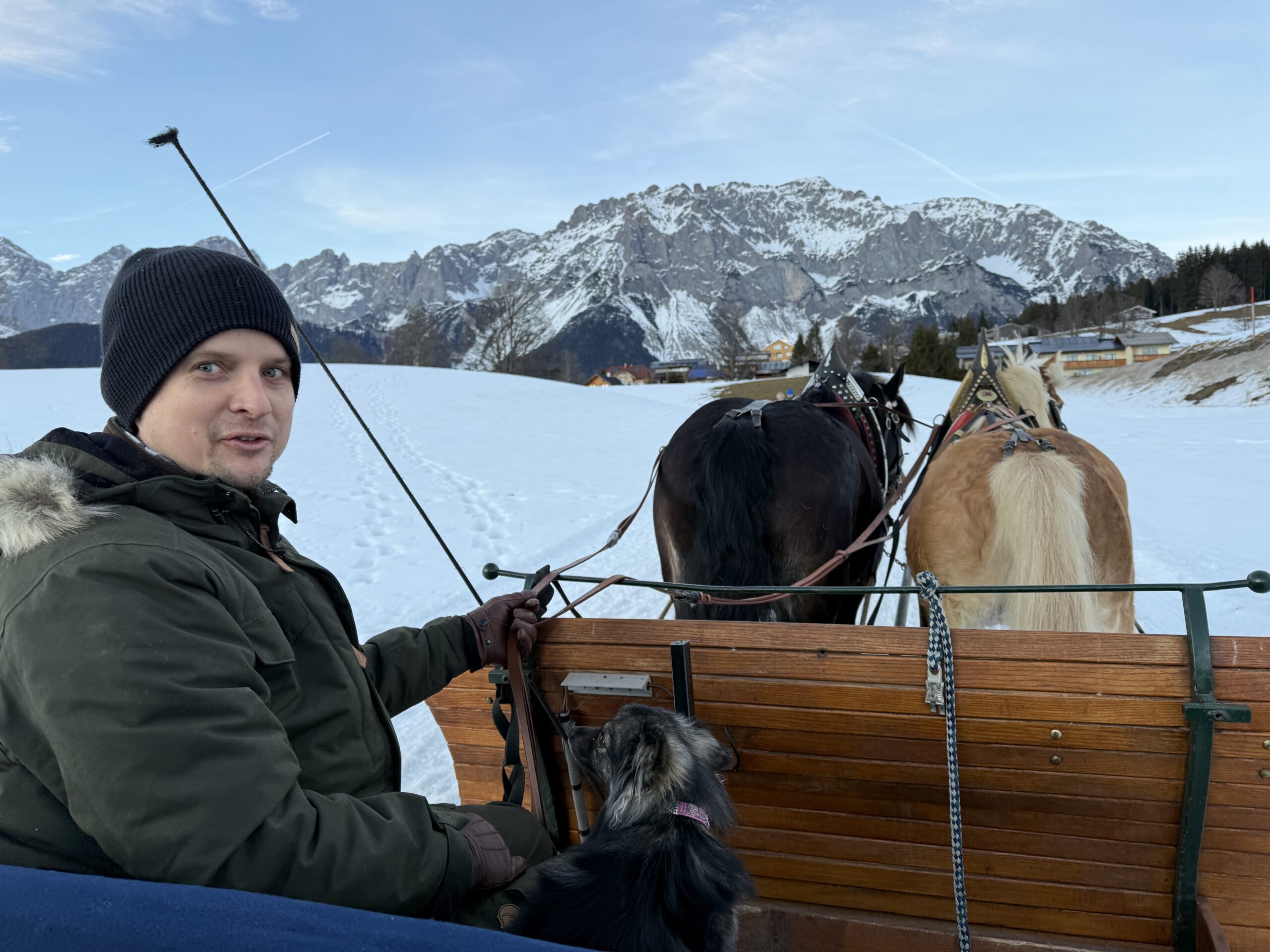 Mit dem Schlitten können Pferdebegeisterte Urlauber eineinhalb Stunden rund um den Kulmberg gefahren werden, mit Blick auf das majestätische Dachsteinmassiv. Hier ein Einblick, wie schön entspannend die Fahrt ist: IMG_5475