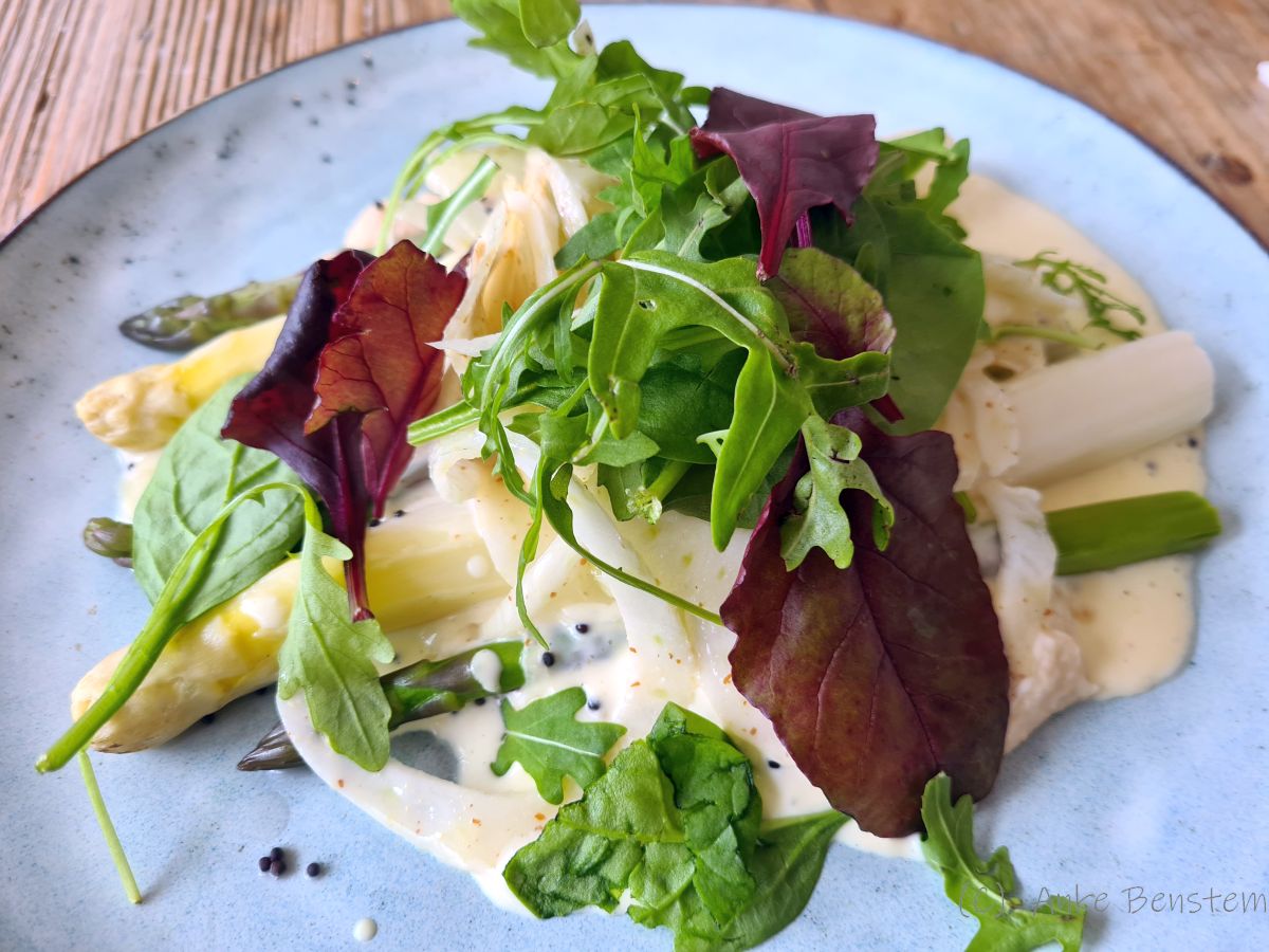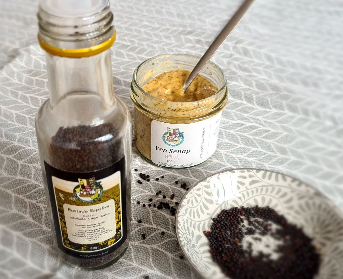 Wenig überraschend, experimentiert auch Julia: Sie röstet zum Beispiel Rapssamen. Man kann die kleinen schwarzen Kugeln ins Müsli oder als Topping auf den Salat tun – richtig lecker! Außerdem backt sie Knäcke aus dem Rapsmehl, das beim Pressen des Öls übrigbleibt. Julia kultiviert auch Lein und presst daraus Leinöl, und sie baut Knoblauch und Senf an. Aus dem produziert sie verschiedene Senfsorten (ich fand den mit Whisky von Spirit of Hven besonders schmackhaft). Ach so, Bienen hält Julia zusammen mit einem Nachbarn auch und hat damit auch eigenen Raps-Honig im Angebot. Grünen Spargel bekommt man bei ihr jetzt im Frühling ebenfalls.