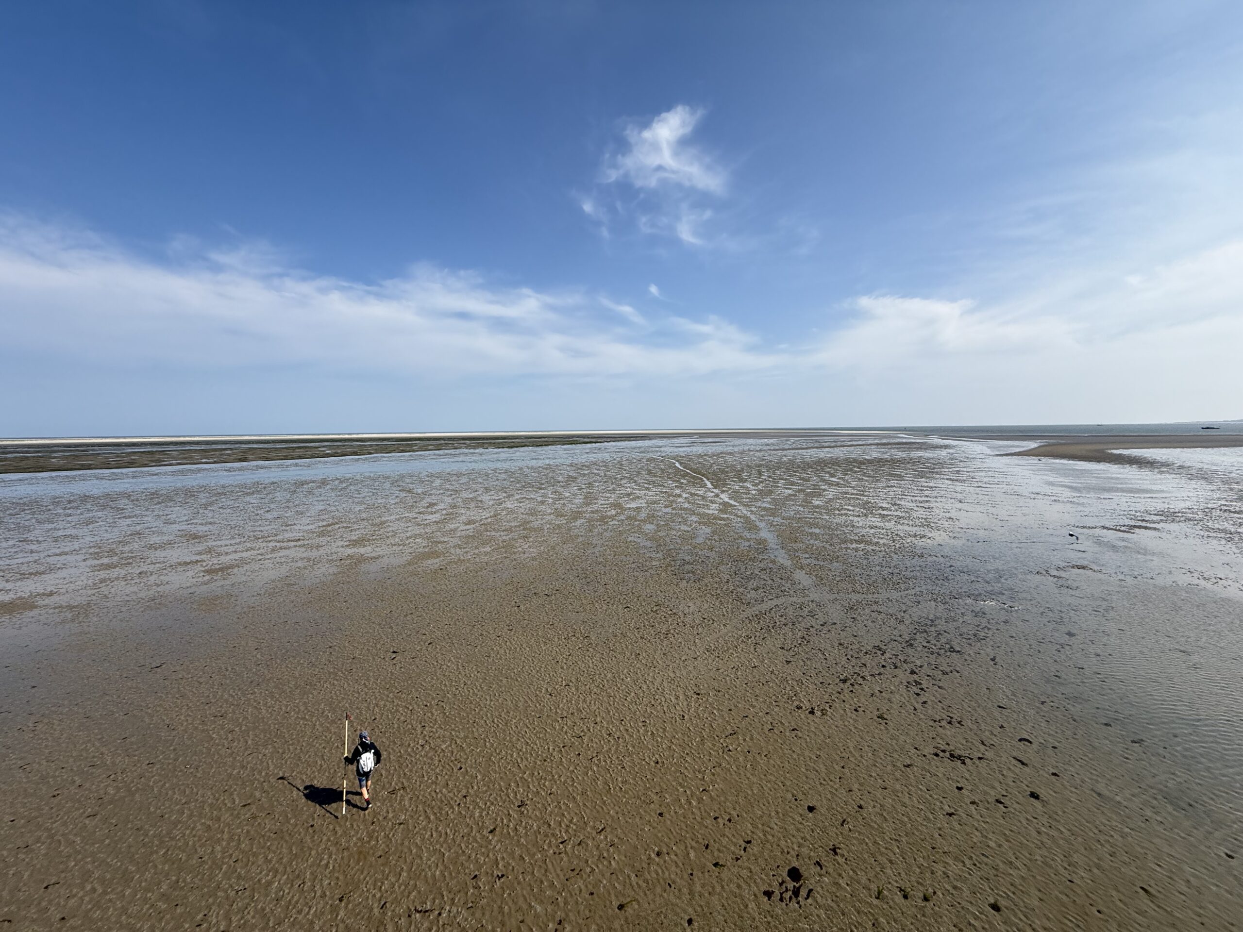 Polleke erläutert auch die extrem wichtige Bedeutung von Rotalgen, die im Wattwasser vor uns schwimmen. „Sie sind bedeutende Sauerstoff-Produzenten. Genauso wie unsere Wälder“, sagt sie und deutet mit ihrem Watt-Stab auf die Alge. Den Stab nutzt sie auch, um den Wasserstand regelmäßig zu kontrollieren.