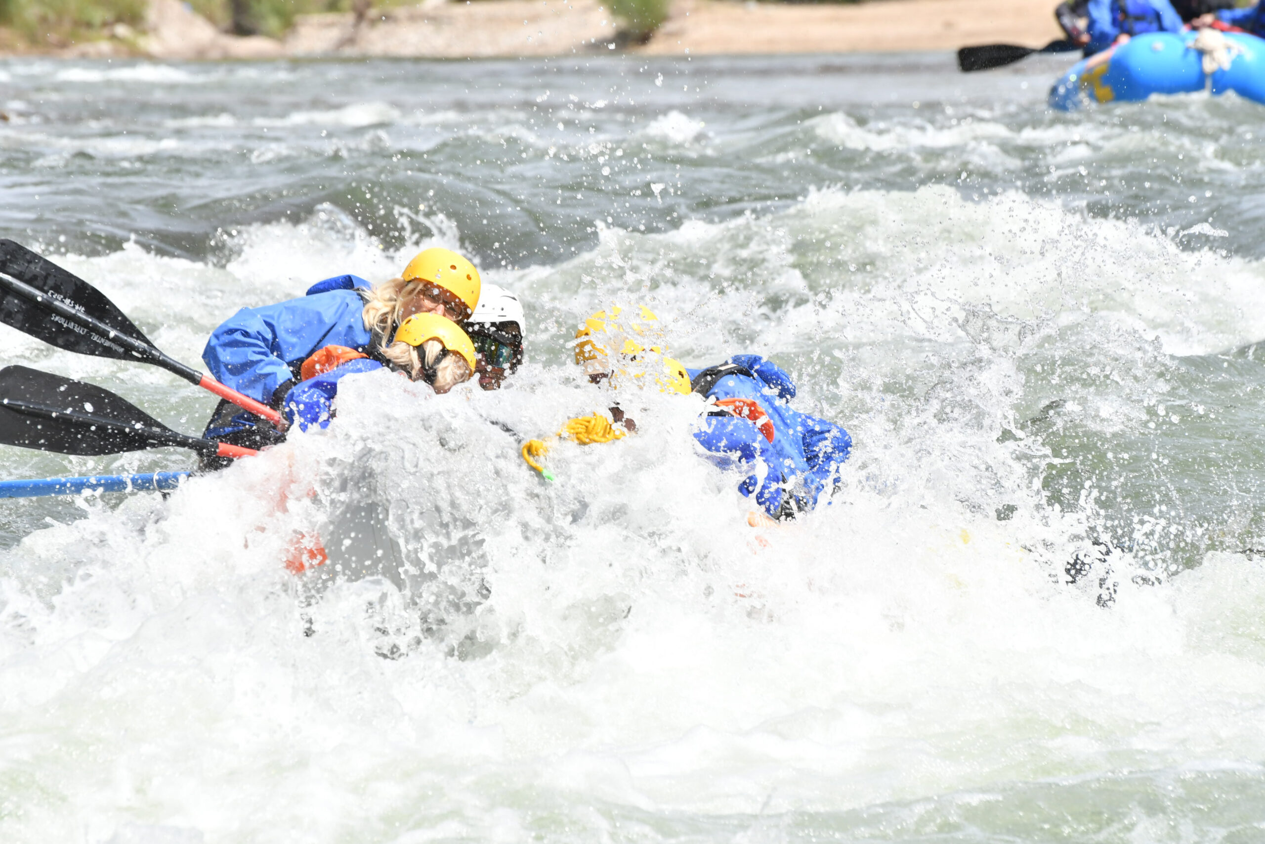 Natürlich stürzt dann einer von uns doch noch ins eiskalte Wasser: Schwups landet mein Vater von einer Sekunde zur anderen im wilden Arkansas, aber hält sich wacker, schwimmt neben dem Boot her. Links und rechts ragen die hohen Felsen und Bolders aus dem Wasser. Unser guide Brandon von Monumental Expeditions zieht ihn schnell ans Boot und reißt ihn mit einem Schwung direkt wieder rauf ins Boot, einmal Körperkontakt gefällig? Brust an Brust. Beide lachen. Mein Vater sieht sichtlich erleichtert aus, dass er wieder im Trockenen ist. Wir sind auf dem Trip „Browns Canyon National Monument“, Schwierigkeitsstufe der Stromschnellen: 2-4, und fahren die nächsten zweieinhalb Stunden und neun Meilen den reißenden Fluss hinunter. Diese Tour ist übrigens buchbar für drei oder fünf Stunden, aber auch über Nacht – inklusive genialem Sternenhimmel, wer Glück hat, kann die Milchstraße beobachten! Einzigartig!