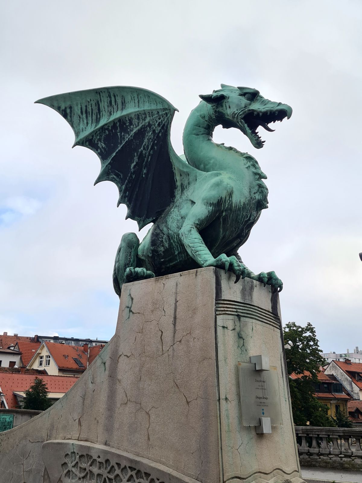 Die Bogenbrücke, 1901 fertiggestellt, gilt als Meisterwerk des Jugenstils. Ein Drache findet sich auch im Wappen von Ljubljana. Doch woher kommt die Drachen-Besessenheit der Stadt? Ich höre, als ich kurz einer Stadtführung lausche, als eine mögliche Erklärung, dass man die aus in der Nähe gelegenen Karst-Höhlen hergespülten Grottenolme für Drachenbrut, also kleine Nachwuchs-Drachen hielt.